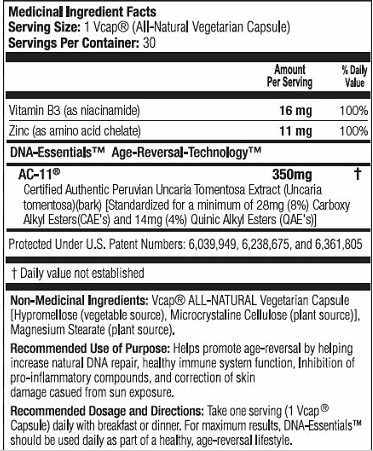 DNA Essentials™ is the result of eleven years of scientific research. DNA Essentials contains natural ingredients in precise formulations to provide advanced age-reversal technology that increases the body’s DNA repair process by 15%. DNA Essentials is an antioxidant and it’s also clinically proven increase sun-damaged skin repair. It increases Collagen III expression in skin and it supports healthy immune system function. DNA Essentials also acts as a natural anti-inflammatory.