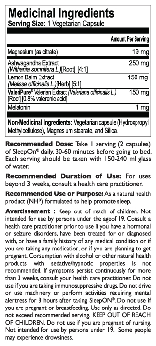 Recommended Dose: Take 1 serving (2 capsules) of SleepOn® daily, 30-60 minutes before going to bed. Each serving should be taken with 150-240 ml glass of water.